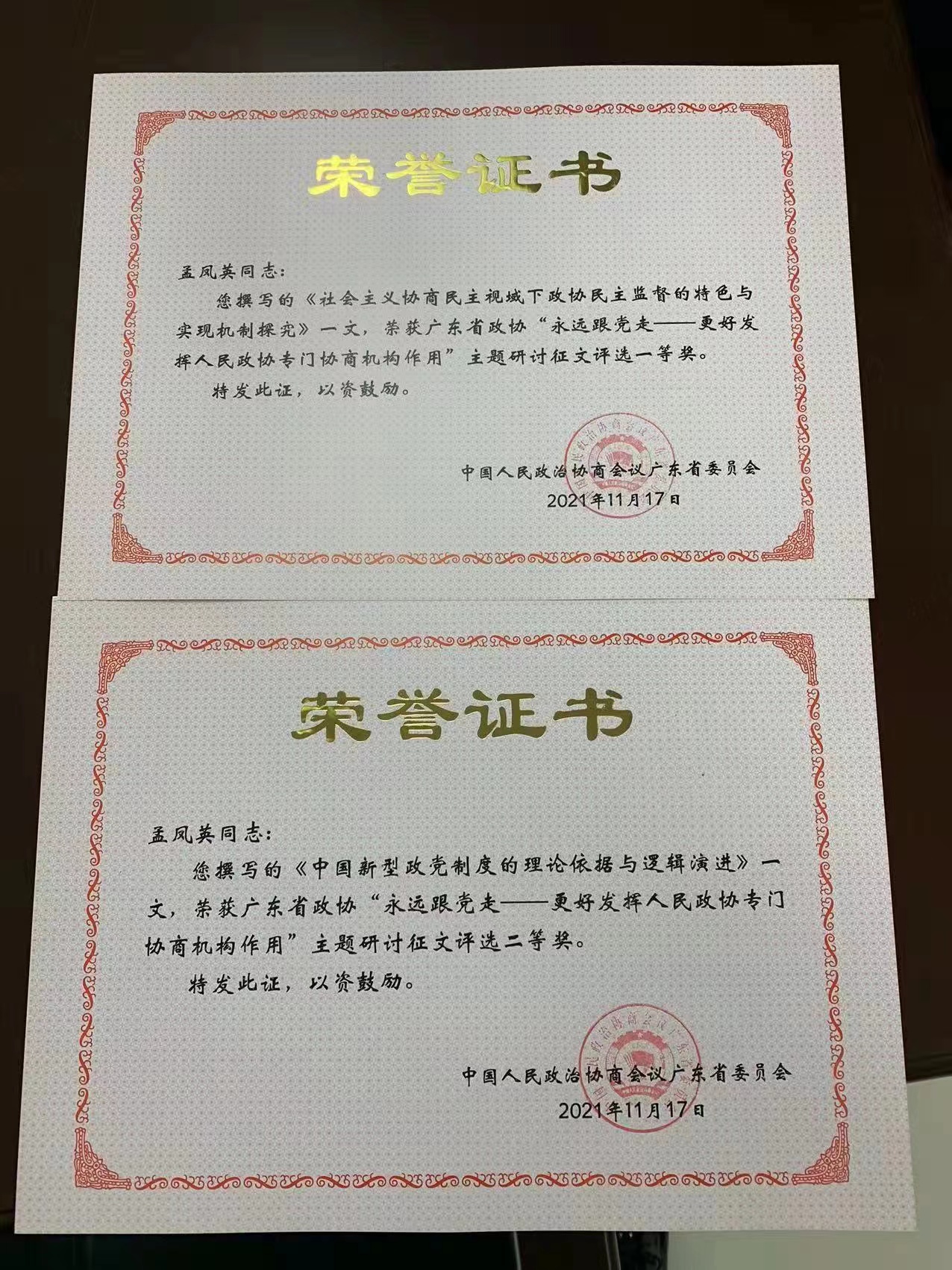 本网讯(记者 陈姣娣)12月12日,我校马克思主义学院孟凤英教授收到了广东省政协寄来的荣誉证书,她撰写的《社会主义协商民主视域下政协民主监督的特色与实现机制探究》和《中国新型政党制度的理论依据与逻辑演进》分别斩获广东省政协“永远跟党走——更好发挥人民政协专门协商机构作用”主题研讨征文一等奖、二等奖!