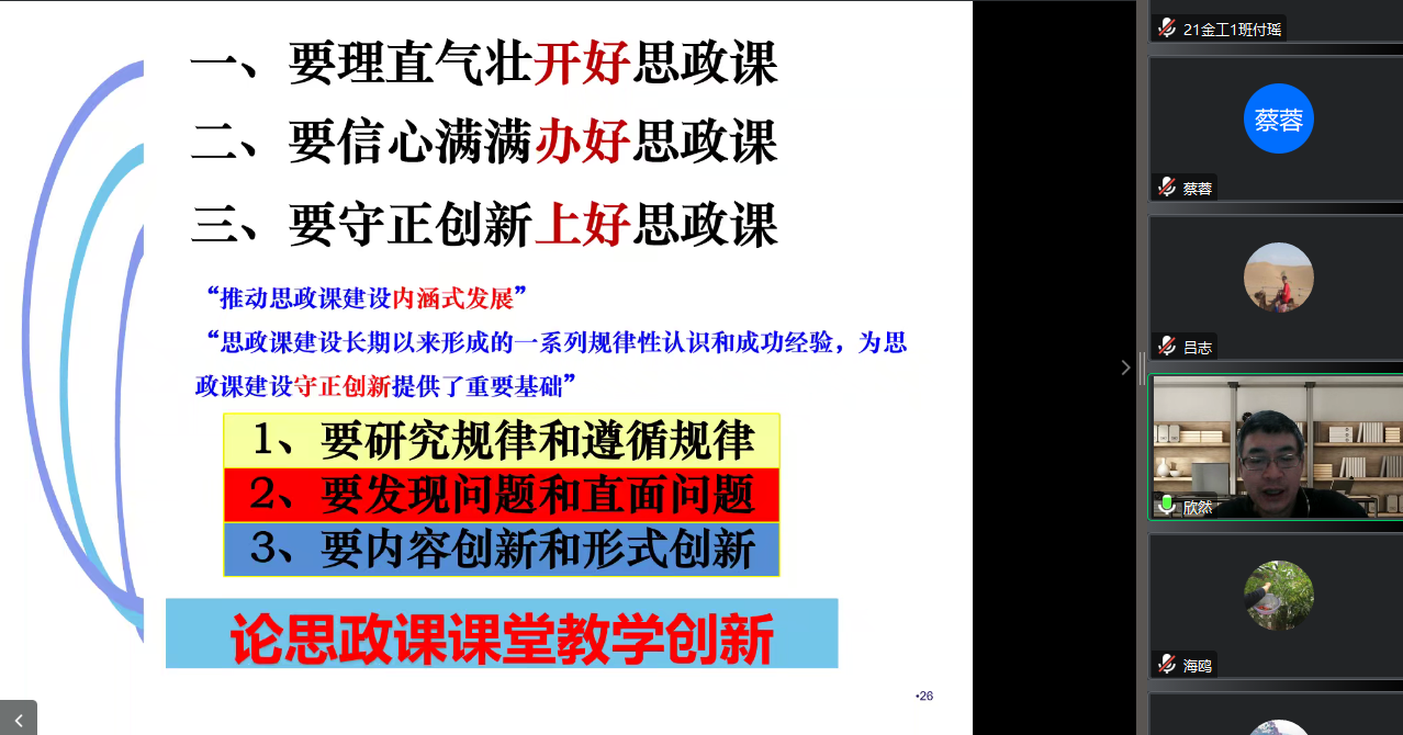 习近平总书记在学校思想政治理论课教师座谈会上提出,讲好新时代的思想政治理论课,必须做到“八个统一”:坚持政治性和学理性相统一,坚持价值性和知识性相统一,坚持建设性和批判性相统一,坚持理论性和实践性相统一,坚持统一性和多样性相统一,坚持主导性和主体性相统一,坚持灌输性和启发性相统一,坚持显性教育和隐性教育相统一。这“八个统一”是对思政课建设长期以来形成的规律性认识和成功经验的科学概括,是对思政课的重大问题和广大教师关注的热点难点问题的深刻回答,是新时代思政课改革创新的根本遵循。刘社欣教授鼓励道,“要把思想政治理论课打造成‘第一主课’把马克思主义理论学科打造成‘第一学科’把马克思主义学院打造成‘第一学院’的宏伟蓝图!”
