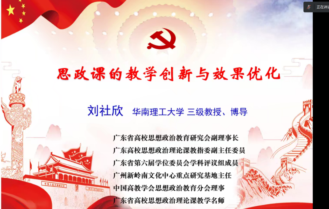 本网讯(记者 付瑶 陈姣娣)为深入学习贯彻党的二十大精神、学习领会习近平总书记的重要讲话精神,为提高我校思政教师的思想政治理论课,3月16日晚上,马克思主义学院特邀华南理工大学三级教授、博导刘社欣开展以“思政课的教学创新与效果优化”为主题开展线上学习讲座。本场讲座由马克思主义学院院长吕志主持,马克思主义学院书记李军及学院教职工参加了会议。