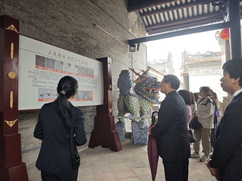 随后,全体成员参观了资政大夫祠。资政大夫祠位于广州市花都区新华镇三华村,它始建于清同治二年(1863年),至今已有一百六十余年历史。现今资政大夫祠已被用来作为广州市花都区博物馆,内设小型的展览,如解放时期的书报画帖、花都当地景泰蓝作品、还有岭南灰塑文化展等,它是花都“新八景”和“十大文化名片”之一。在工作人员的指引、讲解下,大家参观了资政大夫祠古建筑群,观看纪念馆内陈列的文献实物,了解祠堂宗族历史故事,被徐氏兄弟勤奋攻读、体察社稷、勤政爱民的行为感动,体会到古代志士仁人的责任担当。接着大家参观了灰塑非遗展厅,对国家级非物质文化遗产广州灰塑有了进一步的认识。通过学习参观,全体成员纷纷表示,对“文化自信”有了更深的感悟和理解。