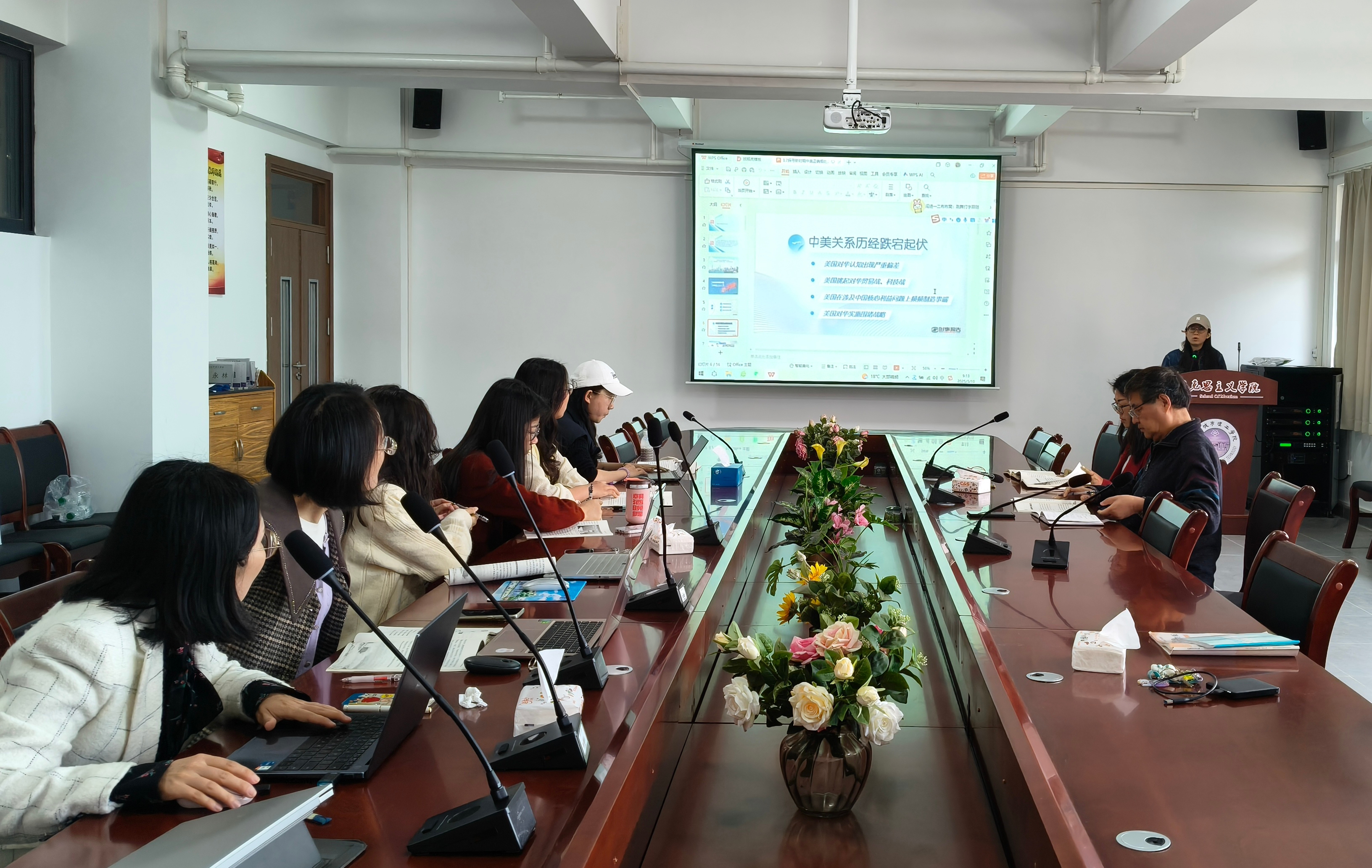 “中美关系是世界上最重要的双边关系之一。中国是最大的发展中国家,美国是最大的发达国家,中美如何相处,既关乎两国人民福祉,也关乎世界前途命运。”会上,贾陶然老师就《探寻新时期中美正确之道》专题内容进行说课。她以“中美互相加征关税”这一时事热点切入,从“中美关系历经跌宕起伏”、“特朗普再度执政的影响”、“解好中美关系的必答题”三个层次分享备课思路。