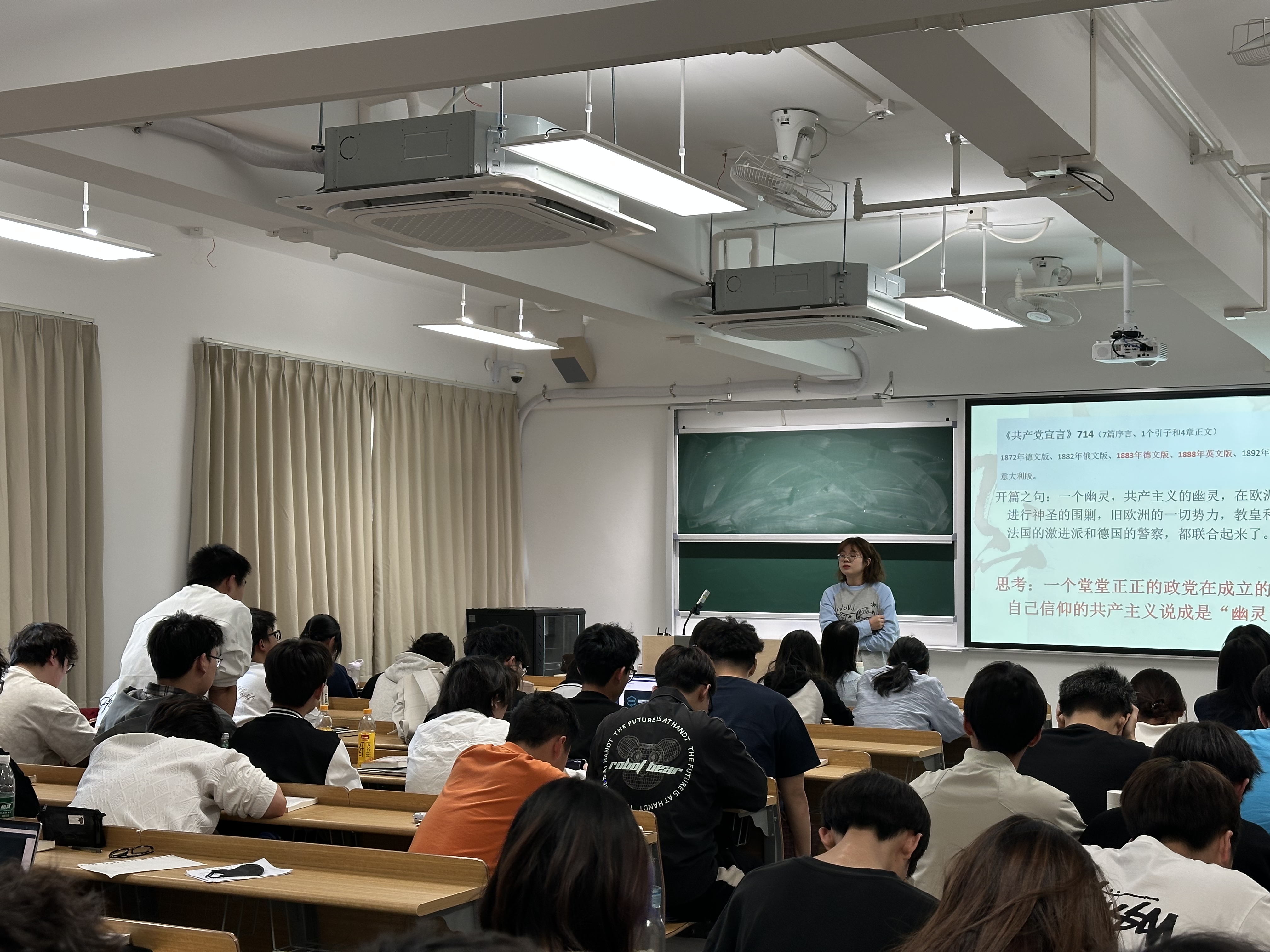 “一个幽灵,共产主义的幽灵,在欧洲游荡。”宋璐瑜老师抛出一个问题:一个堂堂正正的政党在成立的宣言书中怎么会把自己信仰的共产主义说成是‘幽灵’呢?引发同学们热烈讨论,迅速吸引大家的注意力。在讲解《共产党宣言》时,她分析了其诞生的时代背景和重大意义,并从“唯物史观的基本原理、阶级斗争是社会发展的直接动力、资产阶级和资本主义的历史地位、无产阶级革命和无产阶级专政、共产主义新社会”等方面详细讲述了其主要内容。随后,宋璐瑜老师结合案例,从生产力与生产关系的辩证关系到人的自由全面发展等要点,聚焦科学社会主义的基本原则。她还剖析了科学社会主义是如何成为工人运动主导思想的。