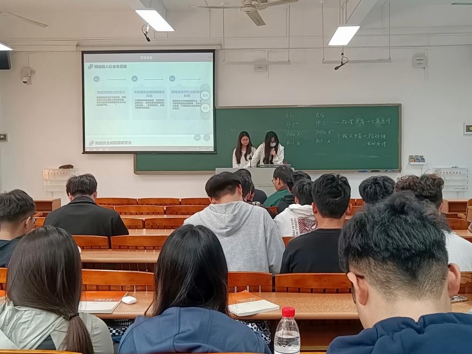 课程伊始,2024级经济学专业学生以“守好网络安全防线”为主题进行小组展示。小组通过数据可视化图表、网络舆情攻防案例,分析了网络空间存在的意识形态渗透、虚假信息传播等潜在威胁,并提出“强化网络法治思维”“提升青年大学生媒介素养”等对策建议。展示结束后,宋娜老师在充分肯定学生学习成果的基础上指出:“网络安全是政治安全的前沿阵地,青年学生既要成为清朗网络空间的守护者,更要做主流意识形态的传播者。”