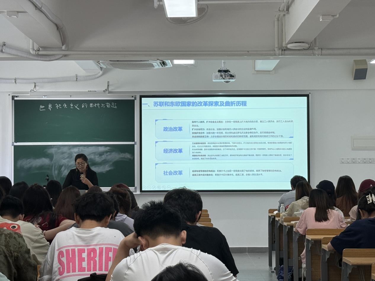 在讲授“苏联和东欧国家的改革探索”时,蒋一娴老师结合丰富的史料,分析了赫鲁晓夫、勃列日涅夫等时期的改革尝试及其成效,并探讨了东欧国家如匈牙利、波兰等国的改革经验与教训。她指出,尽管这些改革未能彻底突破苏联模式的束缚,但为后来的社会主义发展提供了宝贵的历史借鉴。随后,蒋老师深入剖析了苏联解体和东欧剧变的历史过程,从经济停滞、政治僵化、民族问题等多维度解析了其深层次原因,并引导学生思考这一重大历史事件对世界社会主义运动的深远影响。她强调,尽管苏联解体使国际共产主义运动遭受重创,但社会主义并未终结,而是在新的历史条件下探索新的发展道路。在“万马齐喑中的重新奋起”部分,蒋一娴老师重点介绍了中国特色社会主义的崛起,以及中国如何在吸取历史经验教训的基础上,通过改革开放走出了一条符合国情的发展道路。她结合中国的发展成就,阐述了社会主义的生命力和创新性,鼓励同学们坚定理想信念,深入理解社会主义发展的历史逻辑和现实意义。