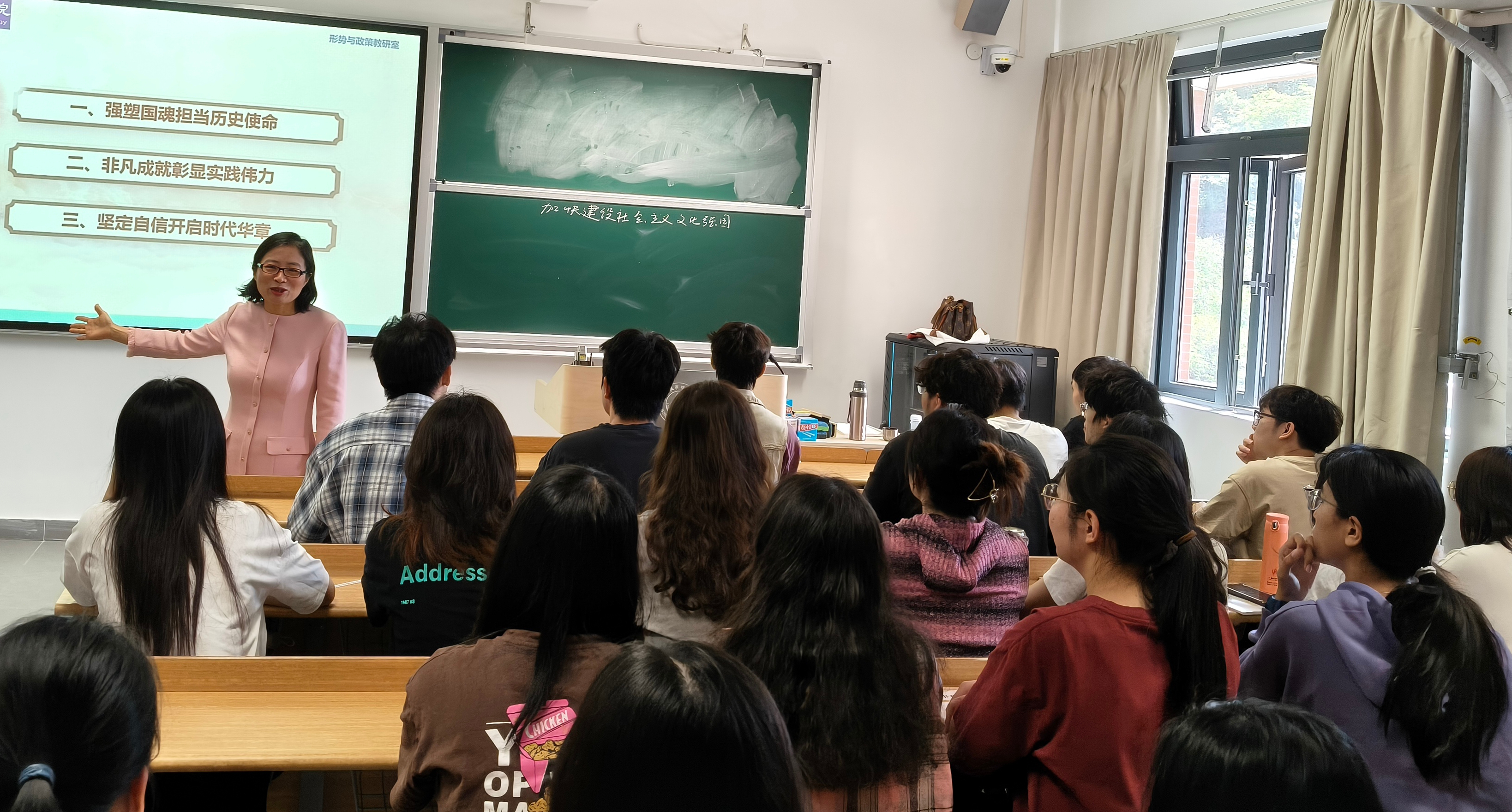 “同学们,2025年以来我国文化领域的哪些事件令你印象深刻?”3月21日上午,邹春梅在A12-510课室面向2023英语1班2班3班开讲《加快建设社会主义文化强国》。她从建设社会主义文化强国的意义、近年来我国文化建设的成就及如何加快建设建设社会主义文化强国三个部分进行授课,课前,邹春梅老师做了充分的学情分析调研,了解到学生已经学了《社会主义发展史》《习近平新时代中国特色社会主义思想概论》这两门课程,对“建设社会主义文化强国”相关知识点掌握较好,且通过互联网、实践活动等渠道对中华优秀传统文化有一定的了解,因此,她以更深入的学理分析、更前沿的知识传授、更直观的往昔对比进行内容讲授,通过互动式教学法、直观演示法、案例分析法、理论讲授法引导广大青年厚植文化情怀、强化文化担当、坚定文化自信,积极投身新时代中国特色社会主义文化建设实践,呈现了一堂思维碰撞与情感共鸣的精彩教学。