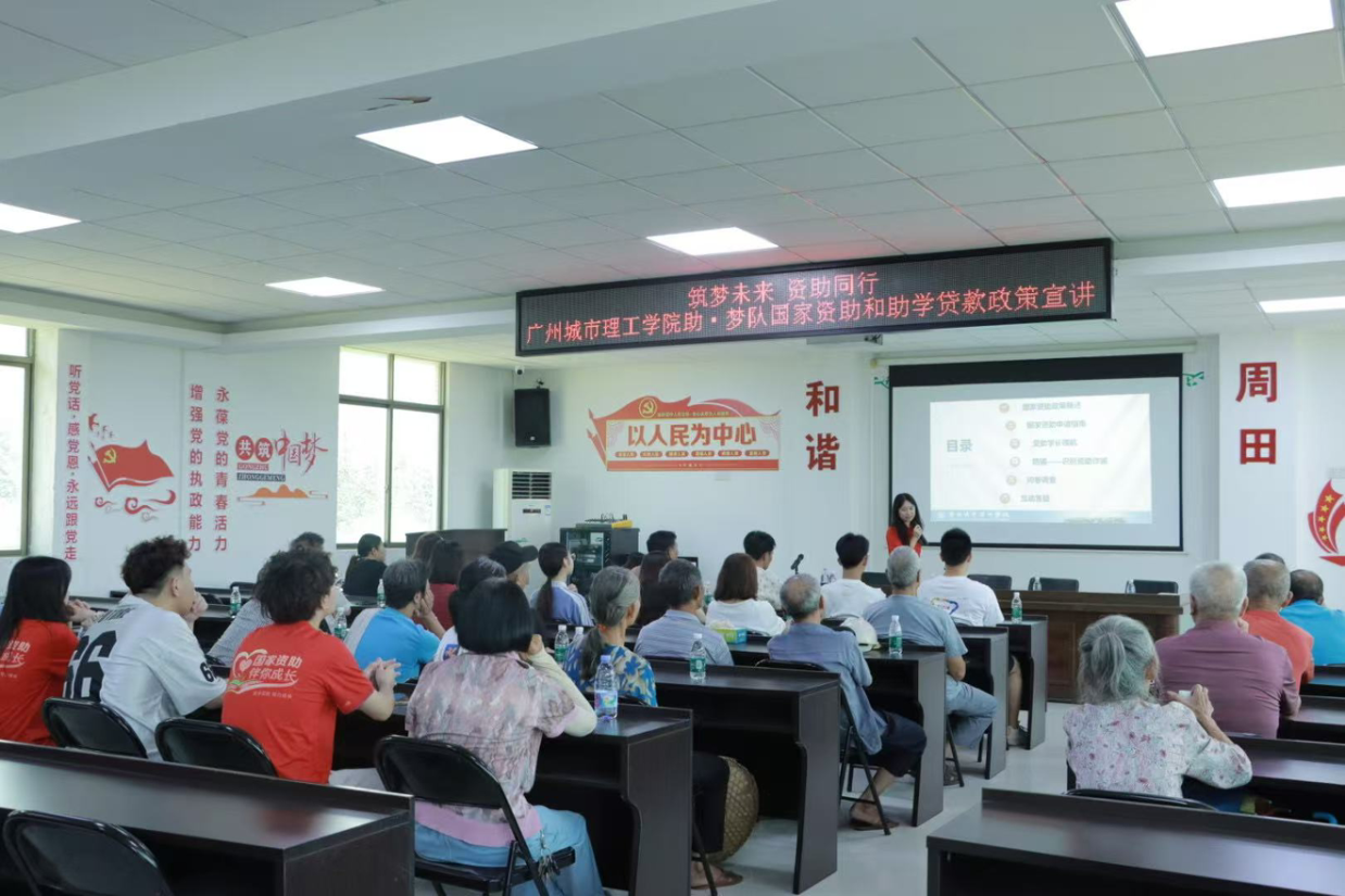 在周田村村委会议室里,电子屏滚动着 “筑梦未来 资助同行” 的醒目标语,墙上“以人民为中心”的标语与现场情形紧密呼应。城理助·梦队员身着印有“国家资助 伴你成长”的红色文化衫,坐于村民中间。来听宣讲的群众既有年轻家长,也有鬓角斑白的老人,眼神里满是对子女教育的关切。