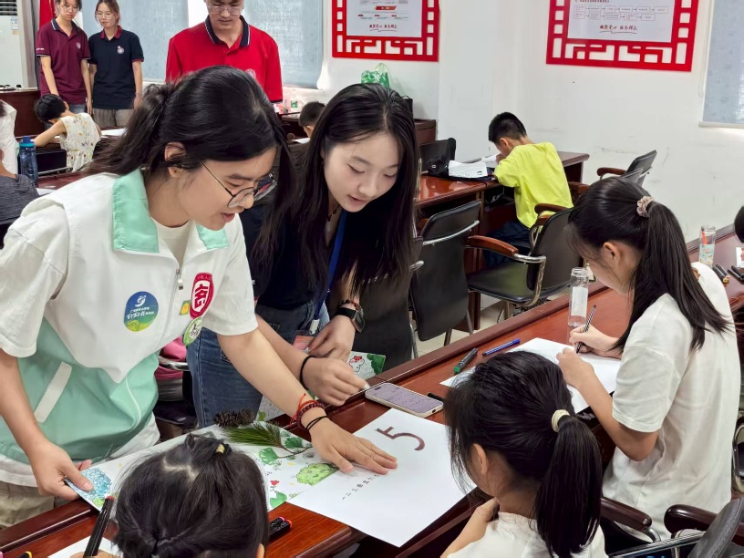 广州城市理工壮志不减实践团和广东培正学院服务队指导小学生制作植物日历 (潘硕 摄)