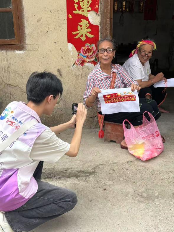 7月10日,薪火探粤者实践团队深入大麦山镇白芒村与新寨村进行实地考察。上午,在奔赴千年古榕途中,团队成员偶遇正在屋檐下专注刺绣的瑶族奶奶。彩线在奶奶指尖翻飞,绣出繁复生动的瑶族纹样。她热情分享刺绣故事,更诚挚邀请团队成员去家中做客。这份淳朴的瑶乡情谊与指尖的非遗技艺,被镜头一一珍藏。