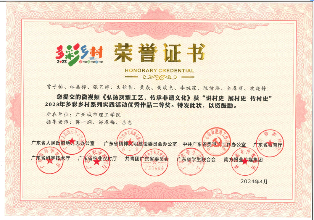 蒋一娴积极践行“实践育人”理念,结出了丰硕的成果。她指导的《醒狮醒国魂、文化在传承》获教育部习近平新时代中国特色社会主义思想大学习领航计划系列主题活动之“我心中的思政课”——第七届全国高校大学生微电影展示活动的短视频组一等奖;《弘扬灰塑工艺,传承非遗文化》获广东省“讲村史 展村史 传村史”2023年多彩乡村系列活动二等奖、三等奖等;YOUNG实践团于2023年入选广东省“百千万工程”重点团队、多彩乡村重点团队,2024年被列为广东省“百千万工程”突击队典型案例。学生团队负责人徐伟均同学说道:“拍摄《醒狮醒国魂、文化在传承》过程中,我了解到醒狮的历史渊源,感受到它所蕴含的家国情怀和民族精神。作为新时代青年,我深感责任重大,我将继续探索和创新,为中华文化的传承和发展贡献自己的力量。”