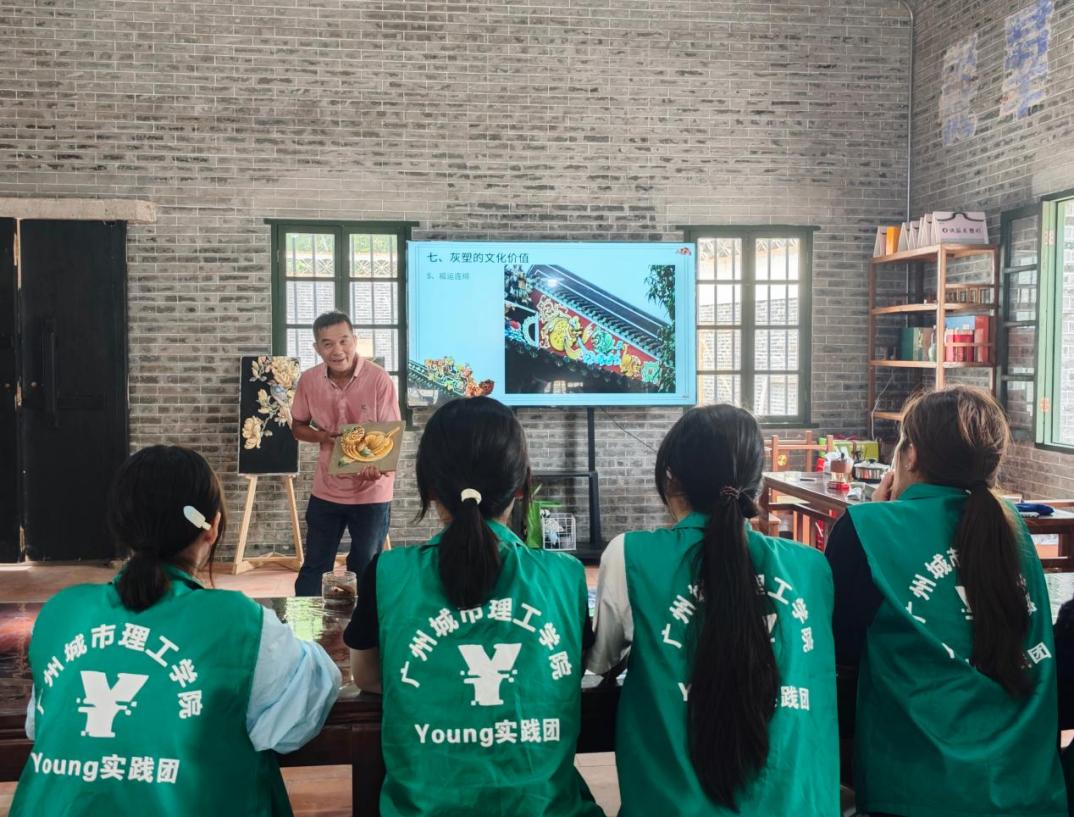 邵成村老师自幼随父学艺,至今已45年。参与过多项岭南古建筑修复项目,包括广州陈家祠、佛山祖庙等历史建筑的修复。近年来,他投身于灰塑制作技艺和知识的宣传和推广工作,对古工艺的传承做出了显著贡献。看到Young实践团的到来,他热情相迎,以广州灰塑为主题为同学们作了一场专题讲座。