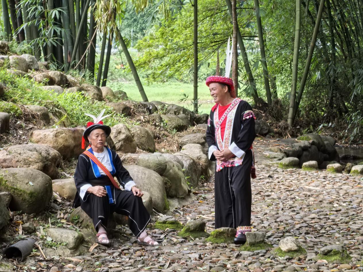 在非遗文化传承一线,团队首站探访清远首个综合性少数民族非遗文创园——拾月拾陆(瑶族)非遗文创园,记录瑶绣、扎染、银饰制作等技艺。深入白芒村,记录瑶族阿婆刺绣及百年古榕;在新寨村,拍摄民族风情墙绘,拜访瑶绣传承人,观察其绣制蕴含历史记忆的瑶族服饰;瑶歌传承人现场展示,团队成员在瑶族阿婆指导下学唱,阿婆即兴编唱瑶歌表达对“薪火探粤者”实践团队欢迎。在上洞村,系统记录县级非遗“唆样”民俗及排瑶婚嫁传统,呈现过山瑶与排瑶习俗差异。团队还前往塘凼村探访过山瑶文化,记录其服饰风格,村民身着传统服饰配合拍摄。这些非遗载体成为宣传片诠释瑶族文化基因的核心素材。