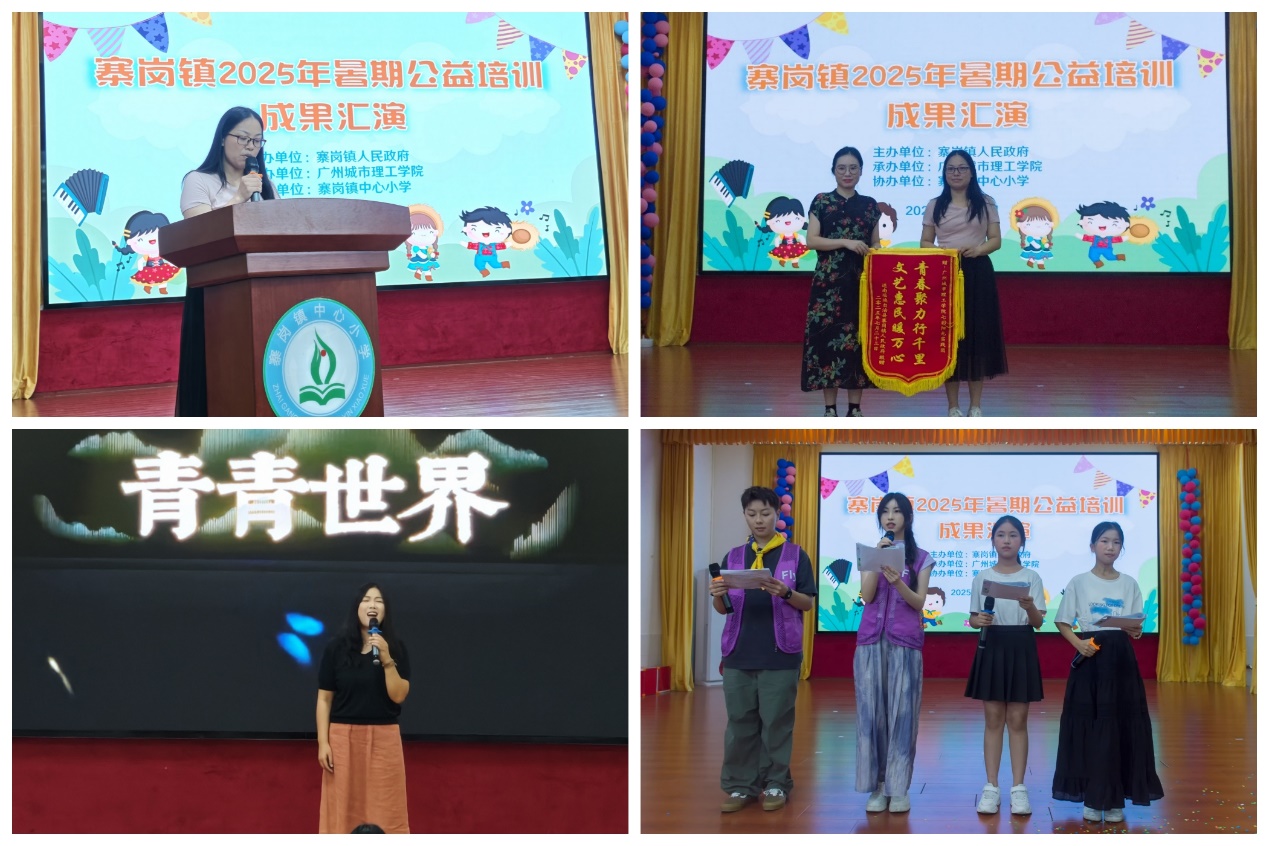 寨岗镇副镇长黄雪萍出席活动并发表致辞。她代表寨岗镇人民政府向广州城市理工学院马克思主义学院的师生团队致以诚挚的敬意,向七彩阳光实践团在这个夏天带来的七彩公益第二课堂致以诚挚的感谢。为助力培养德智体美劳全面发展的新时代好儿童,寨岗镇联合广州城市理工学院开展“七彩假期 筑梦未来”暑假公益课堂,为青少年提供书法、绘画、声乐、舞蹈、模特走秀等5个课程,帮助广大儿童度过一个思想有引领、安全有保障、健康有呵护、情感有抚慰的快乐假期。她表示:“暑期公益培训为乡村孩子们搭建了展示自我的艺术舞台,让他们在术中收获了自信与快乐。教育的意义不仅是知识的传递,更是兴趣与品格的培养。"随后,黄雪萍向七彩阳光实践团颁发锦旗,带队老师黎绮云代表上台领奖。