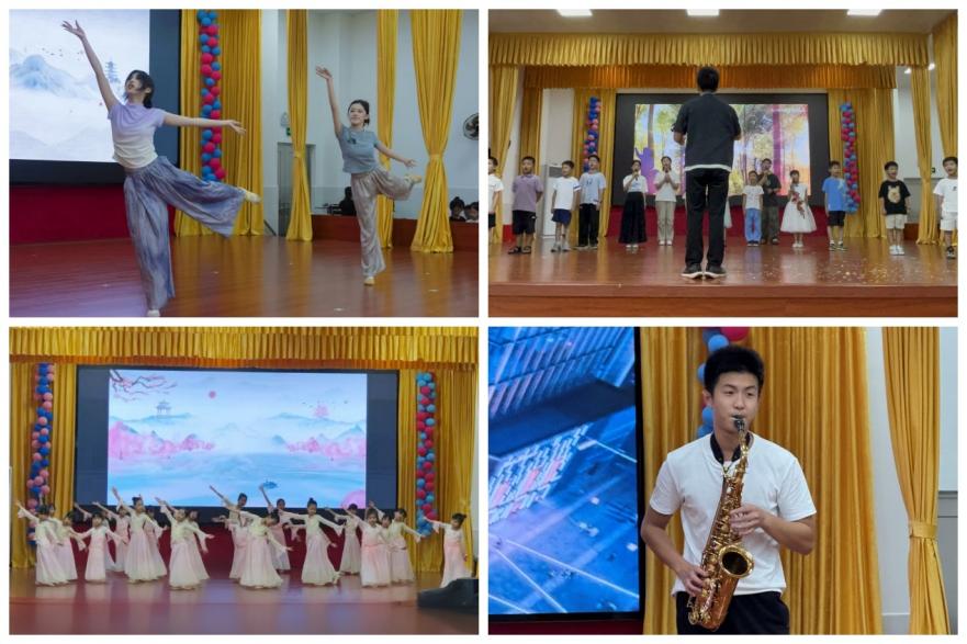 作为音乐班老师代表的实践团队长辛定枭,手持萨克斯,为全场观众深情演绎了经典曲目《成都》。萨克斯特有的醇厚音色将歌曲中的城市记忆与乡愁娓娓道来。魔术师张颖彤表演凭空出现的彩棒、变成彩带的绳子引得全场惊呼连连,孩子们争相探索揭秘“魔法”,不仅带来视觉震撼,更在孩子们心中播下探索未知的种子。舞蹈班老师方小女与阳星月一同演绎了古典舞《春日》。随着悠扬的旋律响起,两位老师衣服飘飘间尽显东方美韵。