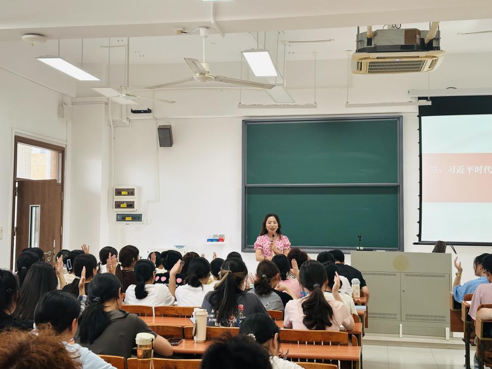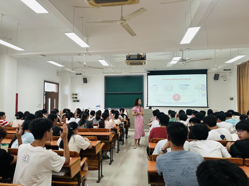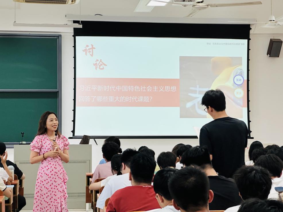 本网讯 (记者 曾丽华)为进一步推动习近平新时代中国特色社会主义思想进教材、进课堂、进头脑,提升思政课教学质量和效果,在9月10日教师节这天,马克思主义学院陈姣娣副教授向大一新生呈现了一堂内容丰富、思想深刻、形式生动的《习近平新时代中国特色社会主义思想概论》示范课。