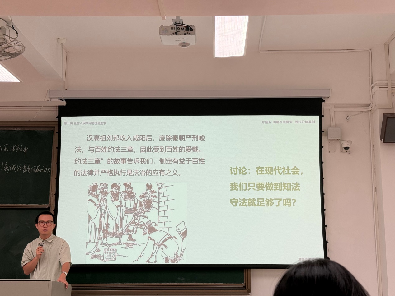 徐达老师围绕第二章第一节“理想信念的内涵及重要性”与第三章“做新时代忠诚的爱国者、让改革创新成为青春远航的动力”展开演练,从细节处设计互动,让教学更具针对性;为避免案例“大而空”,精选贴近学生的案例,用“身边人、身边事”引发情感共鸣;在语言表达上,避免生硬的理论术语,将“理想信念是精神支柱”转化为“理想就像人生路上的灯塔,能在迷茫时指引方向”,让抽象理论更易理解。柯浩伟老师就第四章第一节“全体人民共同的价值追求”,聚焦“社会主义核心价值观的基本内容”“社会主义核心价值观的重要作用”,注重价值理论的系统性建构,从个体价值判断到社会价值共识,从价值认知到价值实践,层层深入,环环相扣。