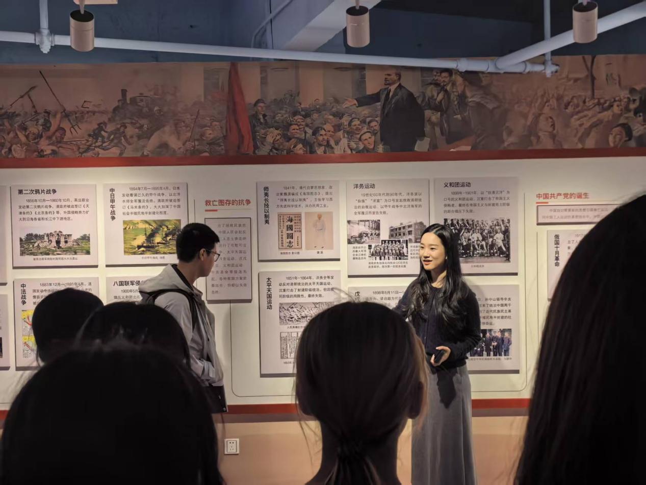 活动中,马克思主义学院罗文嘉老师同步组织建筑学院2025级风景园林2班学生赴基地开展现场教学,推动思政课程内容走深走实。参观过程中,罗文嘉老师运用扎实的理论功底,将教材中的理论知识与展区中的史料呈现有机结合,通过生动的语言,为学生们进行了深入浅出的讲解。在她的引导下,学生们对展陈内容表现出了浓厚兴趣,不时驻足观看、认真聆听,并在交流环节积极分享感受。这种将课堂搬到实践基地的教学方式,不仅创新了思政课的教学形式,更深化了学生对理论知识的理解和认同。