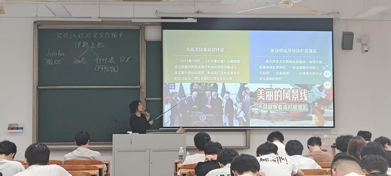 在主体讲授部分,付臣毅老师首先系统阐述了政治安全的科学内涵,从马克思主义国家安全观出发,结合习近平总书记关于总体国家安全观的重要论述,厘清了政治安全的科学内涵。同时,她根据当前世情、国情、党情的深刻变化,深入分析了新时代我国政治安全面临的一系列风险挑战。她强调,政治安全事关党和国家的生死存亡,是国家安全的根本。当前,我国意识形态领域的斗争依然复杂尖锐,一些敌对势力对中国的图谋从未停歇,分化中国的威胁依然存在。通过以案说理、以事明责,让学生们清醒认识到,当前我国政治安全形势总体稳定、可控,但风险挑战依然不容忽视,必须始终保持高度警惕。最后,针对“新时代如何有效维护政治安全”这一核心问题,付臣毅老师从理论与实践相结合的角度,系统阐述了维护政治安全的途径和方法。